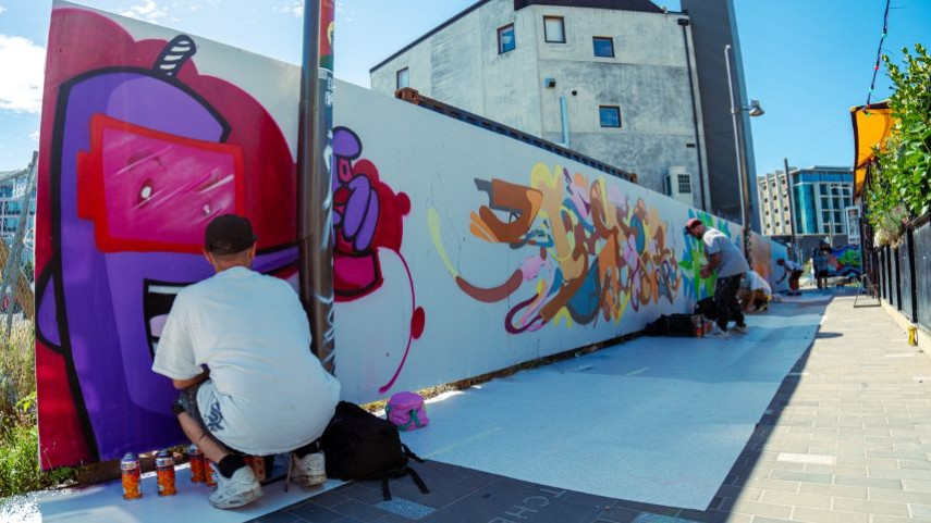 Graff Battle at Christchurch Hip-Hop Summit. Watch 8 artists compete in an epic graffiti showdown. Join us for art, energy, and urban culture.