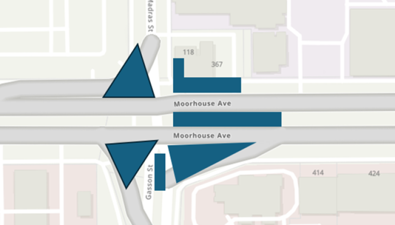 Due to the growing demand from increased population and vehicle activity in this busy part of the city, we're improving pedestrian safety and accessibility at two intersections – Moorhouse Avenue, Gasson Street and Madras Street, and Moorhouse Avenue, Barbadoes Street and Waltham Road.